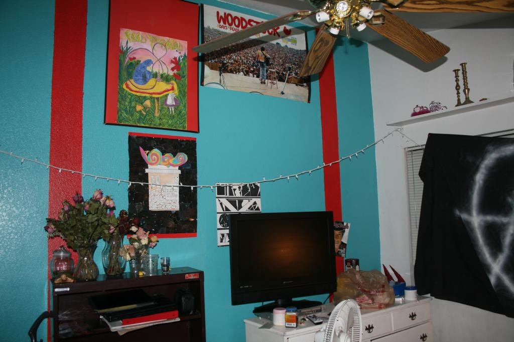 My parents took me to Walmart to color-match the paint to that hoodie. I think they used a scanner that detected the color and then shot out a hex code, but I could be remembering that wrong. I chose that teal blue and two cherry red racing stripes along the main wall - cause, why? I don’t know. I painted for days — only in the thick of it did i realize how hard of a job it was.